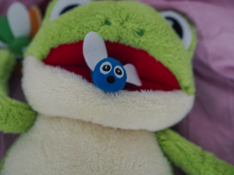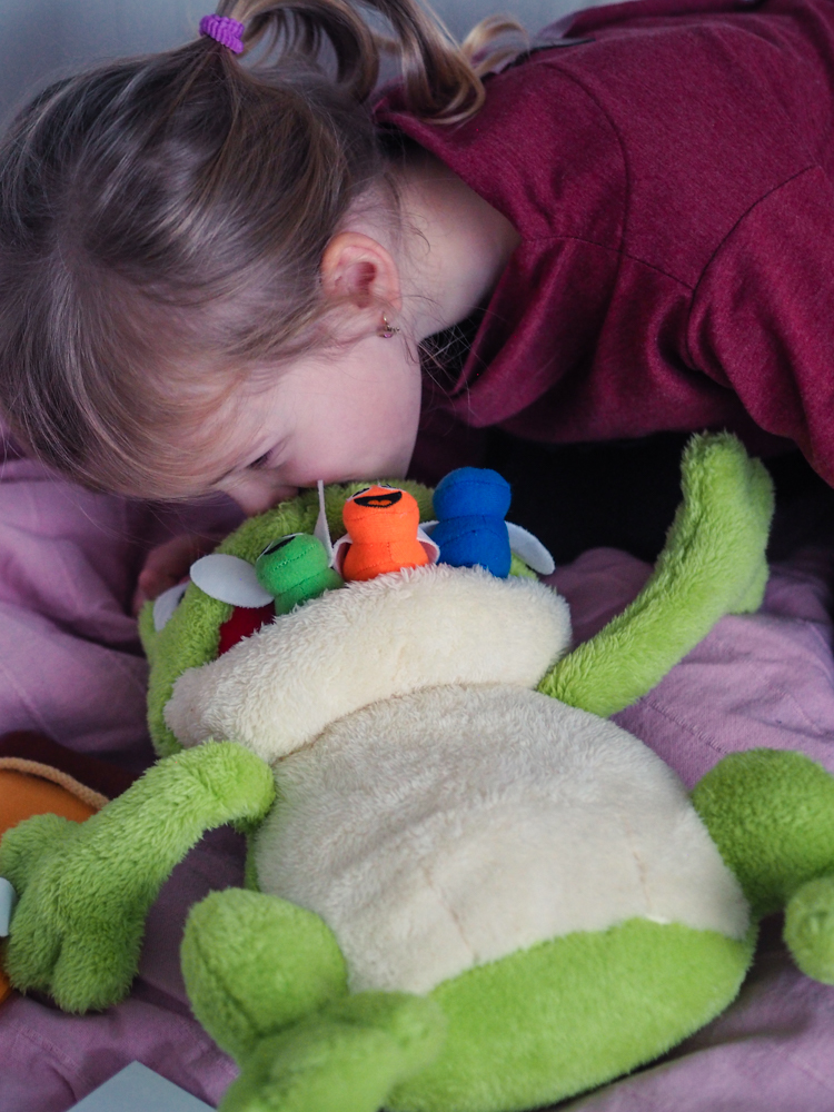Neuvěřitelně jsem se těšila, když zazvonila pošta. Laurinka se na krabici hned vrhla- ono totiž kromě knížky je v balení i velká krásná žába a mucholapka s 8 mouchami znázorňujícími různé druhy pocitů.