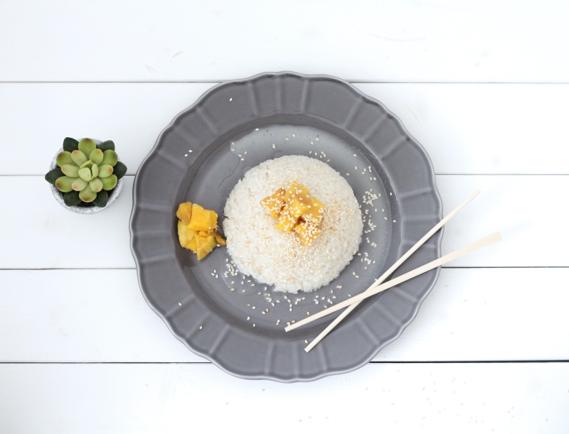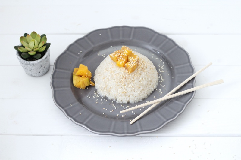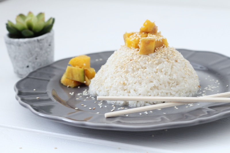 1 hrnek sticky rice (lepkavá rýže, koupit se dá na netu nebo v Sapě)1 mango nakrájené na kousky250 ml kokosového mléka1/2 ČL soli55g třtinového cukru1 PL pražených sezamových semínekPostup:1. Důkladně properte rýži a nechte ji ve vodě alespoň 8 hodin (nejlépe přes noc).