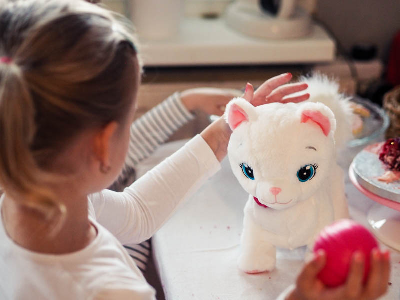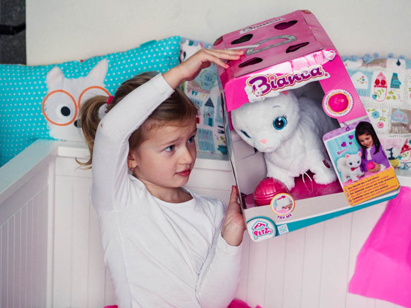 Jako další věc jsme dostali z obchodu Duch hraček neuvěřitelnou kočičku Biancu. Jako upřímně jsem nečekala, že bude mít takový úspěch. Kočička mňouká, chodí, reaguje na volání a na hlazení. Je z velmi příjemného materiálu a Laurinka si ji hned vzala i na spaní do postele 🙂 Takže my moc děkujeme a mňouká se u nás o sto šest! Já si pamatuji, že jako malá holčička, jsem nějaké chodící plyšové zvířátko vždycky hrozně moc chtěla…
