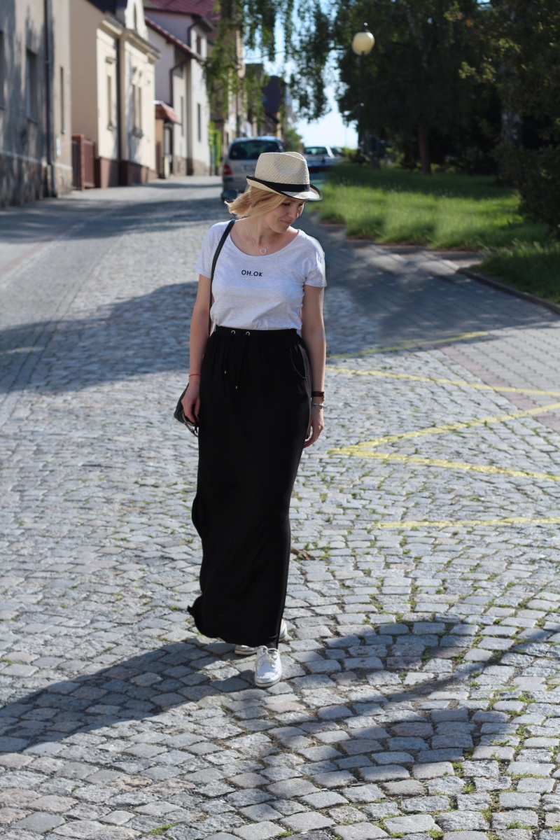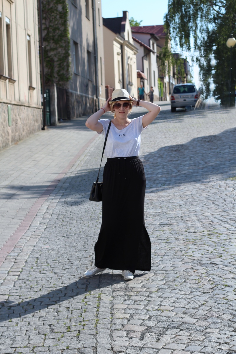 Celý tento outfit- tedy krom tenisek- je nový a asi bude můj oblíbený 🙂 Tentokrát jsem v obchodě automaticky sahala po dlouhé maxi sukni, abych zakryla zbývající kilča a po volném triku na povislé bříško (z prvního porodu mám zkušenost, že se dřív než po půl roce do své původní podoby nedostane :-/ ). Z toho trika mám ale velikou radost, protože mě 100% vystihuje, tohle jsem celá já 😀