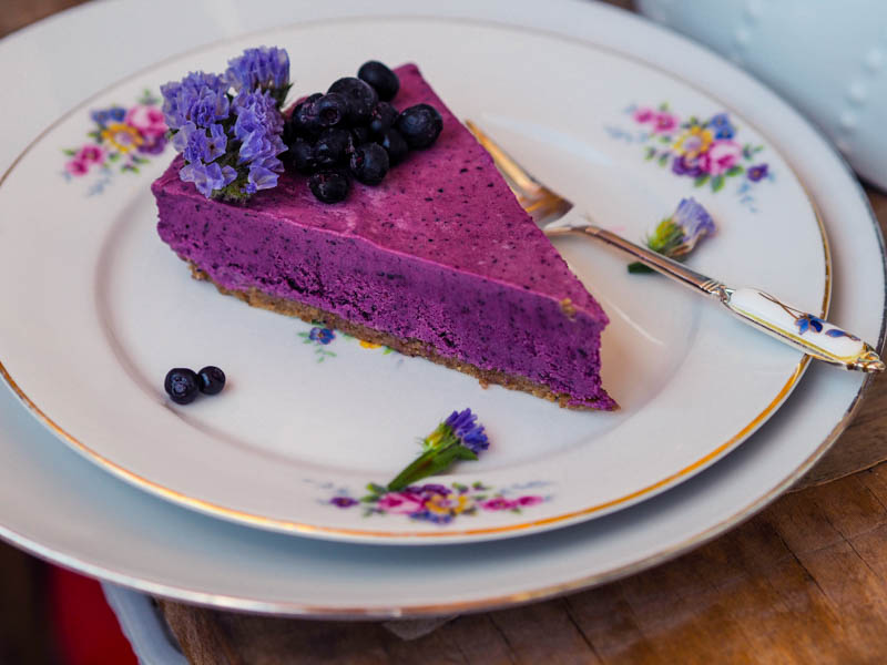 3. Připravíme si náplň, do mixéru /food procesoru dejte osušené kešu ořechy a zbytek všech přísad. Smixujte na jemný krém. Ochutnejte- je na vás, jak sladkou náplň chcete. Já cukr nechci, takže mě ty 2 banány bohatě stačí. Pokud sladíte, klidně přidejte lžíci- dvě medu. To je na vás, jak si to ochutíte. Třeba můžete přidat více borůvek nebo citronové šťávy.