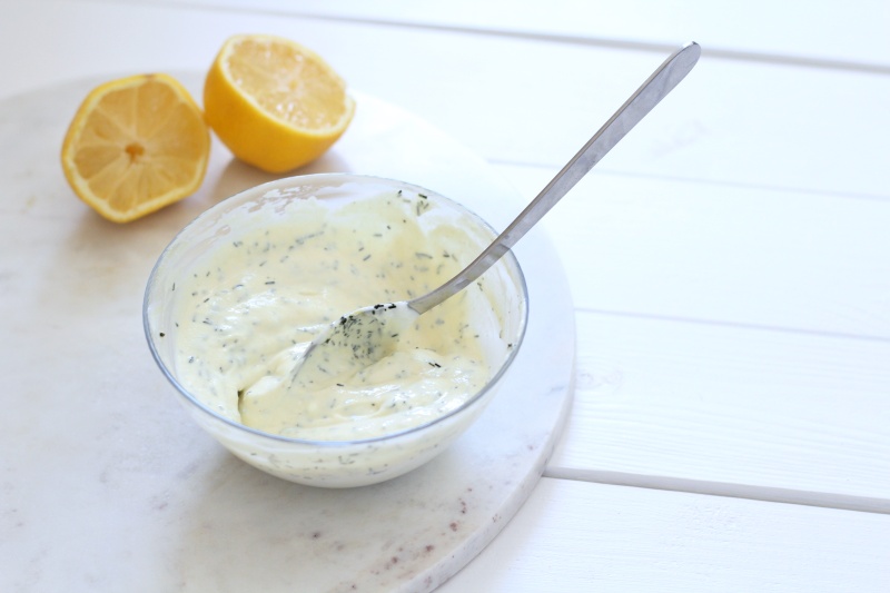 V misce si rozmícháme jogurt s hořčicí, koprem a šťávou z citronu, dochutíme solí a pepřem.