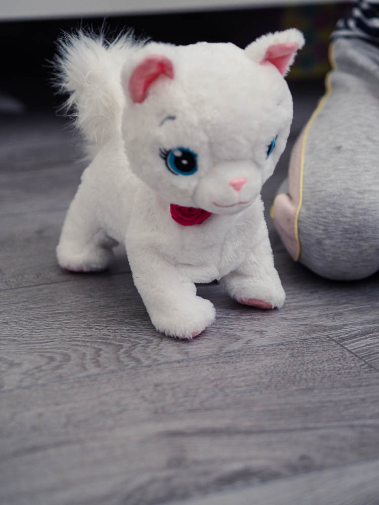 Největší terno je ale chůze. Je k ní přiložen růžový míček, který napodobuje klubíčko příze a když ho přiblížíte k hrudi, kočička začne chodit. Akorát nám trvalo, než jsme přišli na to, že klubíčko nestačí jenom přiblížit, ale je potřeba k hrudi přiložit k tomu určený znak, aby Bianca fungovala 🙂